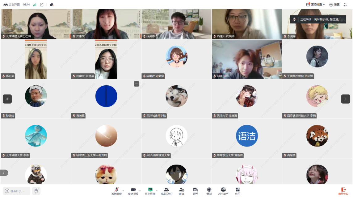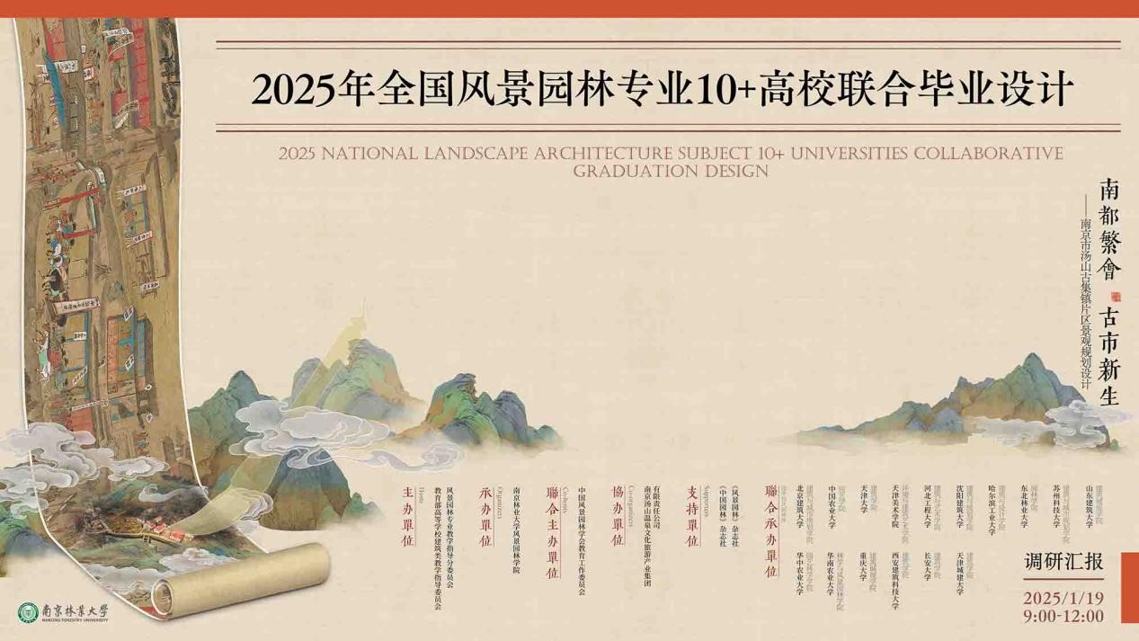 由教育部高等学校建筑类教学指导委员会风景园林专业教学指导分委员会主办、牌九游戏 承办“2025年全国风景园林专业10+高校联合毕业设计”活动,以“南都繁会,古市新生——南京汤山古集镇片区景观规划设计”为主题的前期调研与初步构思汇报交流会,于2025年1月19日(星期日)上午9时,在云端顺利拉开帷幕。共有来自17所高校的130余名师生代表参加活动。通过线上平台分组汇报与点评的方式展现了他们对场地的独到见解和深度思考。