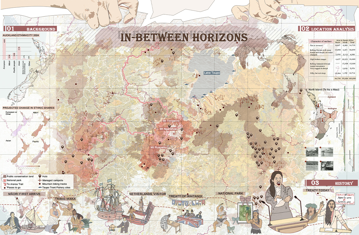 本次获奖作品《In-Between Horizons: Hybrid Ecologies and Third-Space Wisdom in Tongariro》聚焦新西兰汤加里罗国家公园的土地协商规划。设计通过识别第三景观特征,运用GIS-MSPA技术识别生态廊道与敏感斑块,并叠加产权与族群格局以界定“间者地带”;通过分区引导、三方共治与可达性控制等策略,有效缓解保护与开发、全球化与本土文化之间的张力,推动生态系统与社区的协同治理。